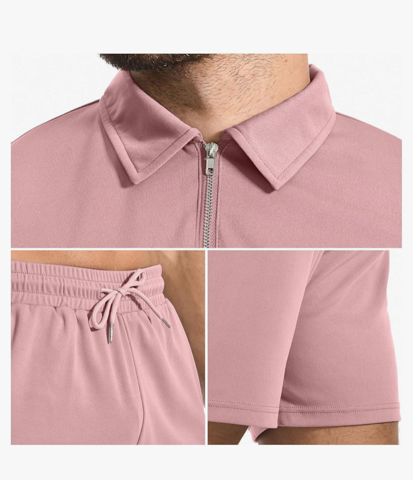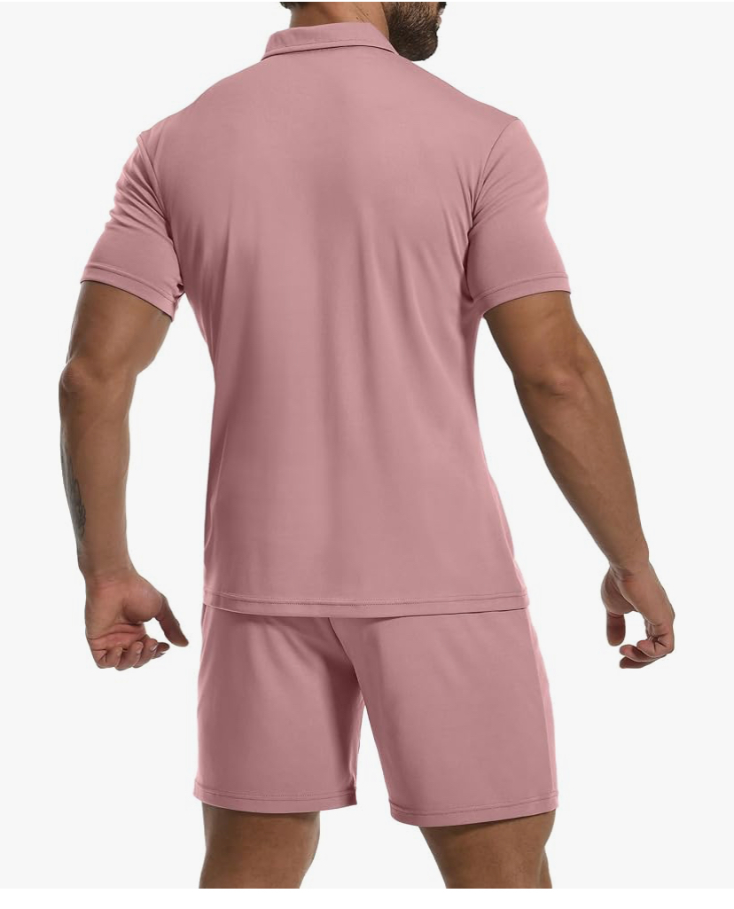 Short Sleeve Casual Polo Shirt and Shorts Sets Two Piece Summer Outfits Zip Polo Tracksuit Set for Men color pink available size small, Medium, X-Large- XX-Large $75.98
